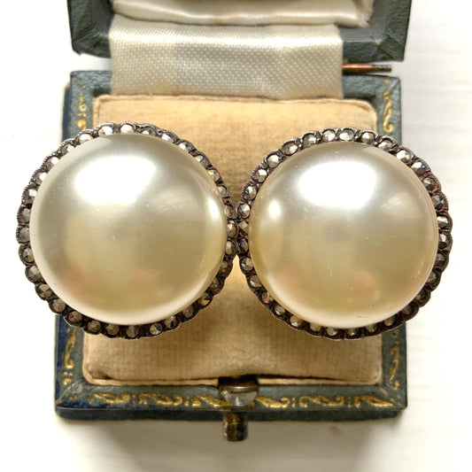 VINTAGE Pearl Button & Marcasite Screw-Back Earrings