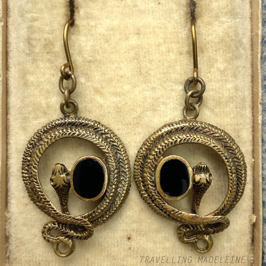 1950's Gold/Brass Tone Snake & Black Enamel Pierced Earrings