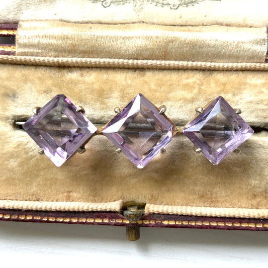 ANTIQUE 3 Diamond-Shaped Amethysts Silver Bar Brooch