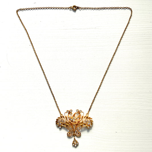 ANTIQUE ART NOUVEAU Gold-Tone Leaf & Bird Rhinestone Necklace