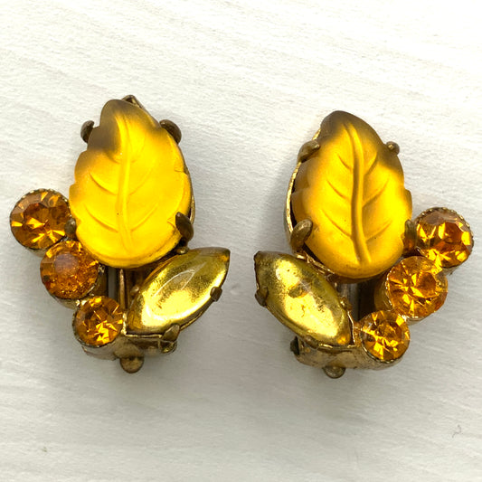 VINTAGE 1950's Orange/Amber Frosted Leaf Glass Clip Earrings