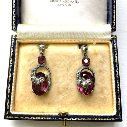 VINTAGE Marcaiste & Purple Oval Rhinestone Dangle Screw Earrings