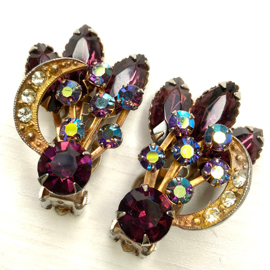 VINTAGE 1950-60's Purple Rhinestone & Gold Tone Crescent Clip Earrings
