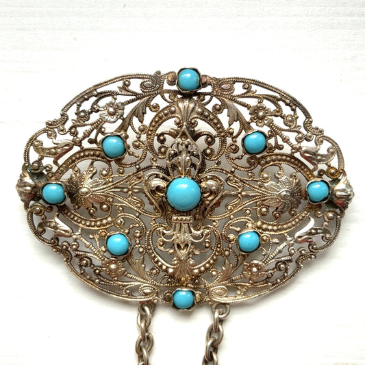 ANTIQUE Silver Tone Filigree Fleur de Lis & Turquoise Glass Brooch