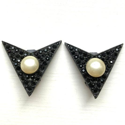 KJL VINTAGE 1970s-80s Black V-Shaped Metal with Rhinestones & Glass Pearl Clip-On Earrings
