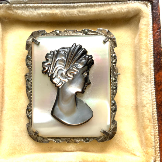 VINTAGE 1950s-60s Mother of Pearl Cameo & Silver Frame Brooch & Pendant