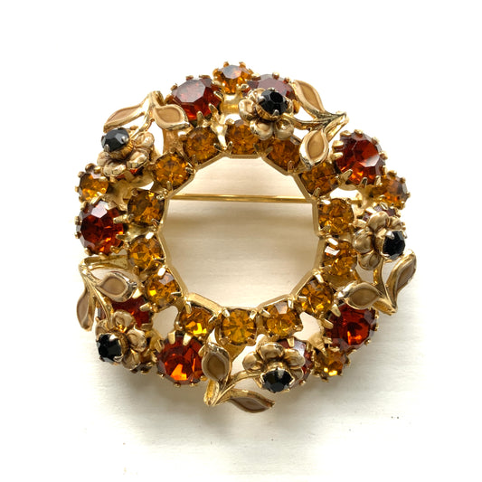 VINTAGE 1960s Enamel Flower & Amber Rhinestone Wreath Brooch