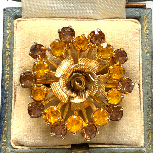 VINTAGE Gold Tone Rose & Amber Rhinestone Brooch