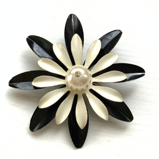 VINTAGE 1960s Black & White Enamel Flower Brooch