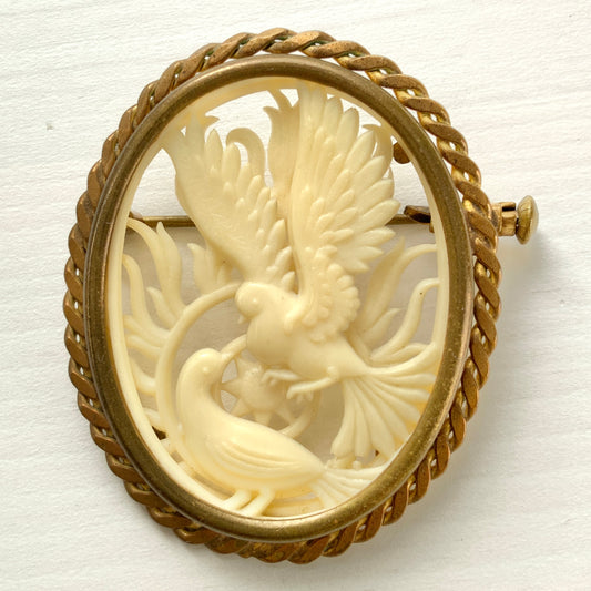 VINTAGE 1920s-30s Celluloid Openwork Two Birds Oval Brooch