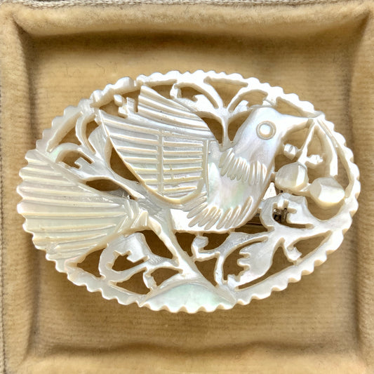 VINTAGE 1960s Bethlehem Mother of Pearl Carved Dove Bird Oval Brooch