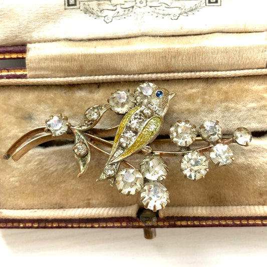 VINTAGE 1930s Yellow Enamel Bird on Silver-Tone Rhinestone Branch Brooch