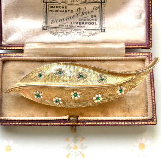 VINTAGE Gold Tone Leaf & Rhinestone Flowers Brooch