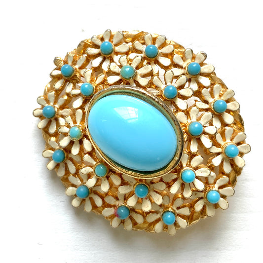 VINTAGE Light Blue Cabochon & Enamel Flower Brooch