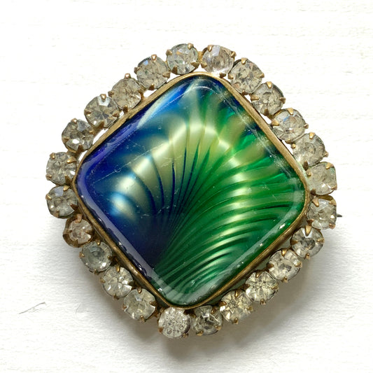 VINTAGE ART DECO Peacock Feather Marble Square Glass & Rhinestone Brooch