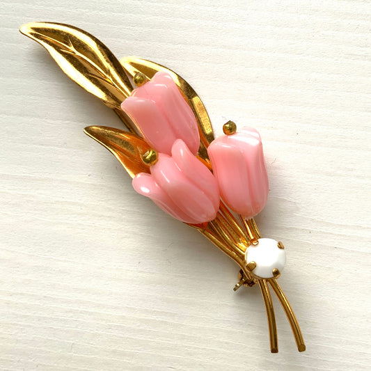 VINTAGE 1940's Pink Plastic Tulip & Gold Tone Leaves Bouquet Brooch