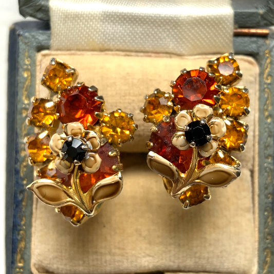 VINTAGE 1960s Enamel Flower & Amber Rhinestone Clip-On Earrings