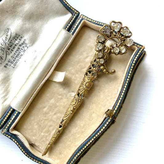 ANTIQUE Gold Tone Filigree & Rhinestone Tussie-Mussie or Buttonhole Holder