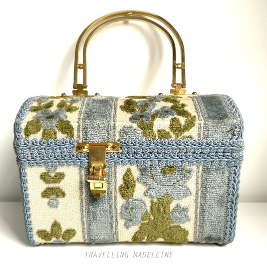 VINTAGE 1970s Blue Floral Chenille Box Purse/Bag