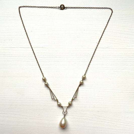 VINTAGE ART DECO Gold Tone Metal & Teardrop Glass Pearl Necklace