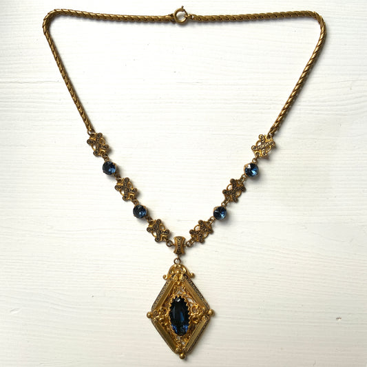 VINTAGE ART DECO Lapis Glass Filigree Necklace