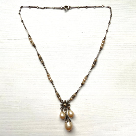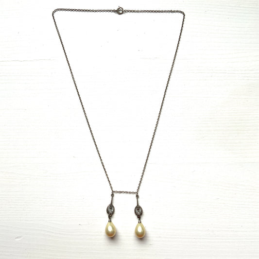 VINTAGE ART DECO Marcasite & Teardrop Glass Pearl Silver Necklace