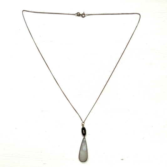 VINTAGE ART DECO Black Glass & Mother of Pearl Teardrop Silver Necklace