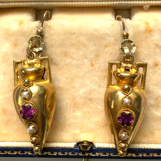 ANTIQUE VICTORIAN Etruscan Revival Gold Spike Dangle Pierced Earrings with Purple Rhinestone & Seed Pearls