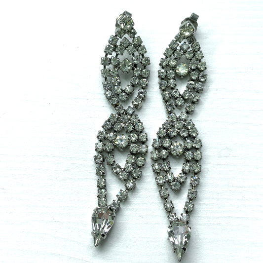 VINTAGE ART DECO Clear Rhinestone Wave Motif Silver Earrings