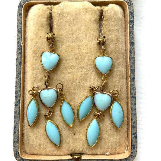 VINTAGE 1920s Turquoise Heart Glass Fringe Pierced Earrings