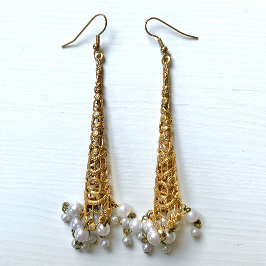 VINTAGE 1950s Gold Tone Filigree & Pearl Fringe Pierced Earrings