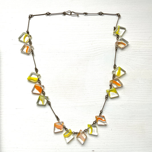 VINTAGE ART DECO Orange & Yellow Swirl Glass Diamond Necklace