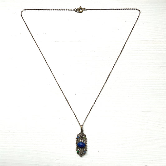 VINTAGE ART DECO Lapis Glass Filigree Necklace