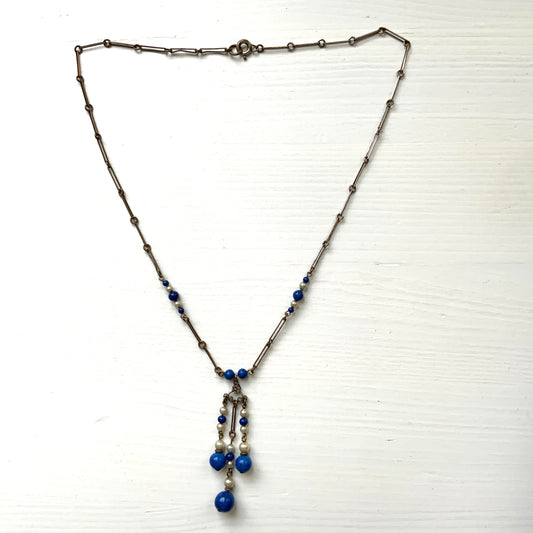 VINTAGE ART DECO Blue Mottled Glass & Pearl Fringe Necklace