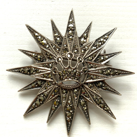 VINTAGE Marcasite Starburst Crown Silver Brooch