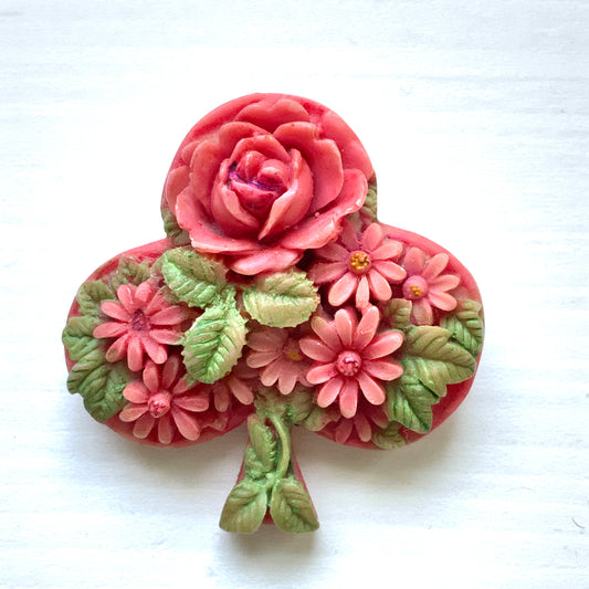 VINTAGE Plastic Red Rose & Flower Clover Brooch