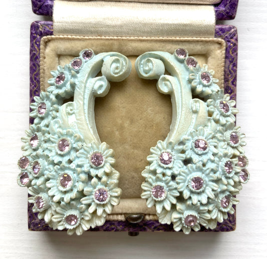 VINTAGE 1950s Light Blue Celluloid Paisley & Lilac Rhinestone Flower Clip-On Earrings