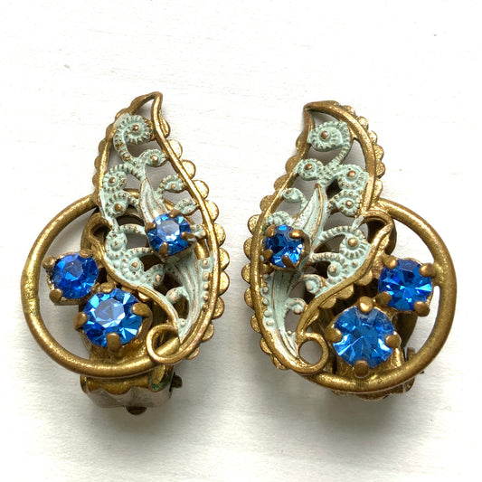 VINTAGE 1950s Light Blue Filigree Feather Clip-On Earrings