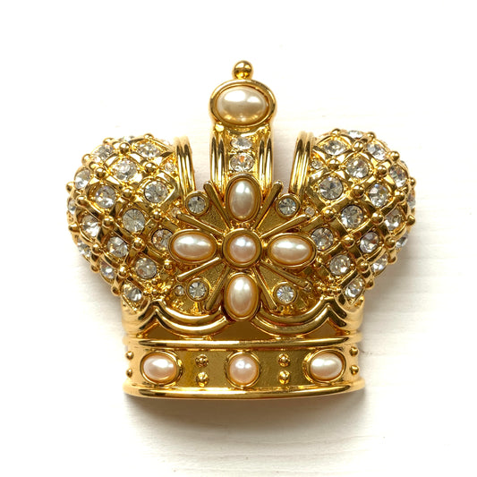 VINTAGE 1990s CABOUCHON Gold Tone Rhinestone & Faux Pearl Crown Brooch