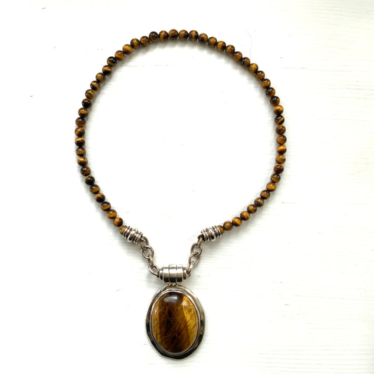 VINTAGE 1990s JOSEPH ESPOSITO Tiger Eye Big Oval Silver Necklace