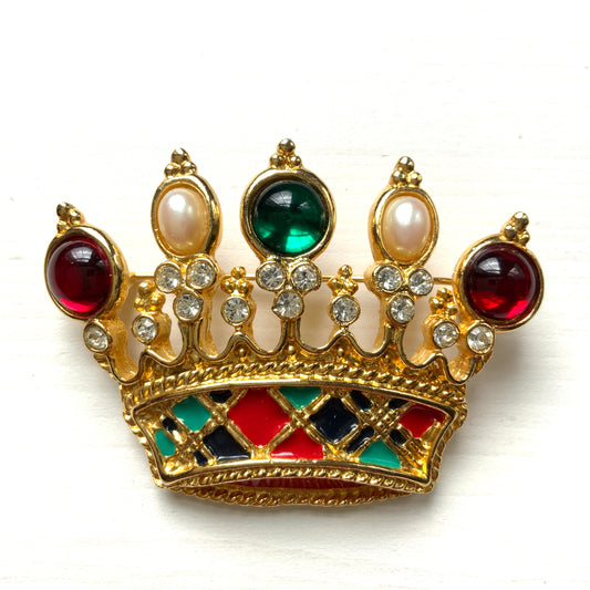 VINTAGE 1980s-90s Enamel Tartan Check Crown Brooch