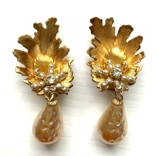VINTAGE Gold Tone Leaf & Teardrop Glass Pearl Clip-On Earrings