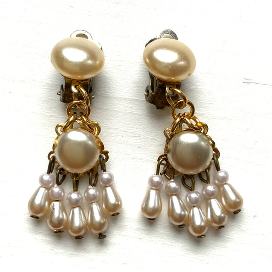 VINTAGE 1950s Faux Pearl Fringe Clip-On Earrings