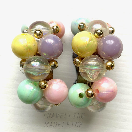 ヴィンテージ 1950 年代 パステル マルチカラー プラスチック ビーズ ハーフフープ クリップ イヤリング