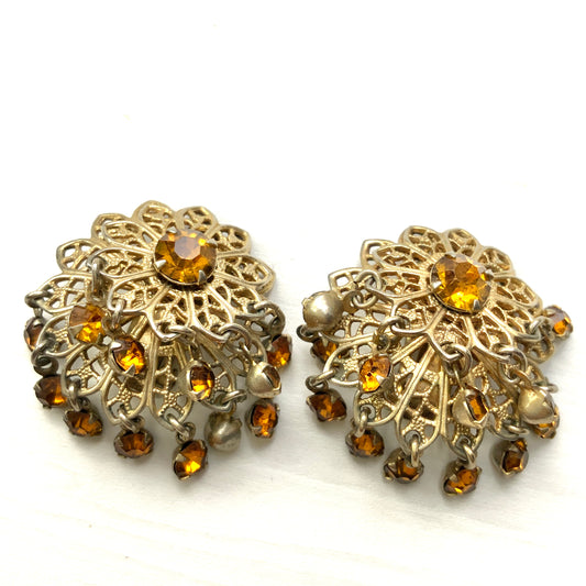 ヴィンテージ 1950-60 年代 ゴールドトーン フィリグリー フラワー オレンジ/アンバー ラインストーン フリンジ クリップ イヤリング