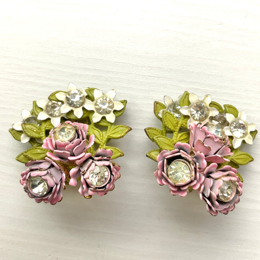 ヴィンテージ 1950 年代 エナメル ピンクローズ & ホワイトフラワー クリップイヤリング