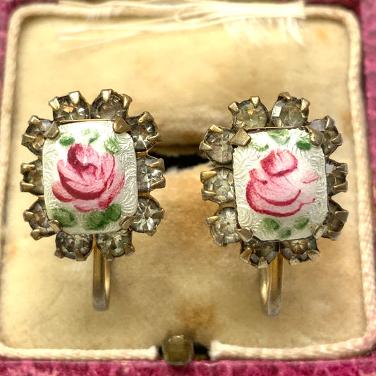 ヴィンテージ 1950 年代 エナメル ギョーシェ ピンクローズ & ラインストーン スクリュー イヤリング