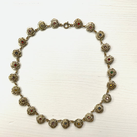 ヴィンテージ メタル ローズ & マルチカラー ラインストーン チョーカー ネックレス