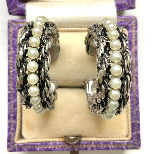 ヴィンテージ シルバートーンロープ&グラスパール フープ クリップイヤリング