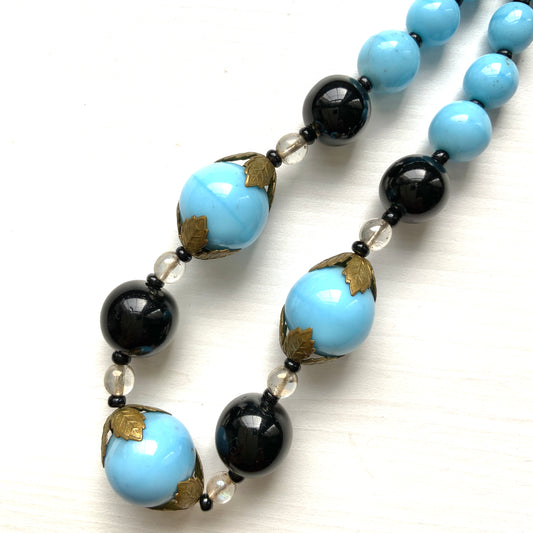 ヴィンテージ 1930 年代 ターコイズブルー & ブラック ガラス ネックレス